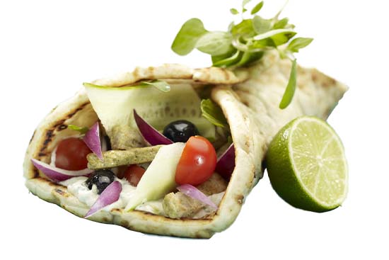 Server Slåtto Strimlet Kyllingkjøtt Gyros i Slåtto Gyrosbrød med vår Tzatziki.